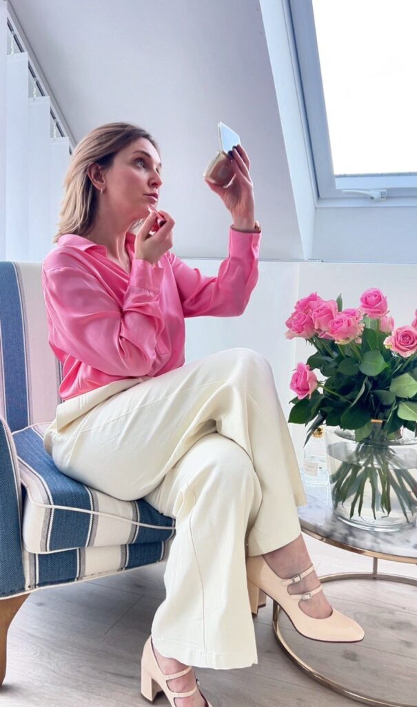 Dette er ofte et ryddende øyeblikk, fordi det viser seg at problemet ikke ligger i snittet eller figuren, men i fargens nyanser. Vi ser også på forskjellen mellom farger som bæres nær ansiktet og dem som fungerer bedre i de nedre delene av antrekket – og hvis du vil, ser vi også på sminke og tilbehør.